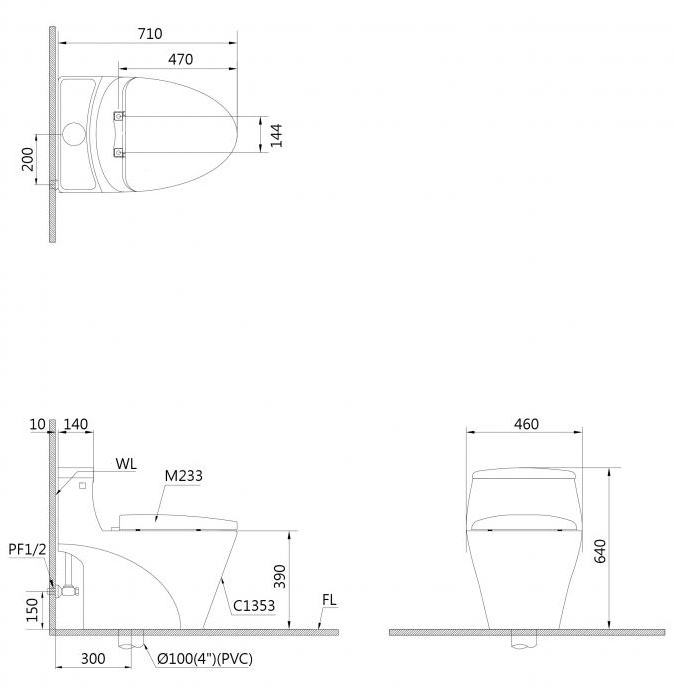 - Tâm thoát phân: 300 mm