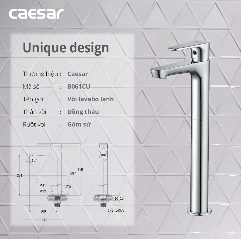 Thông tin vòi lavabo Caesar B061CU lạnh thân cao