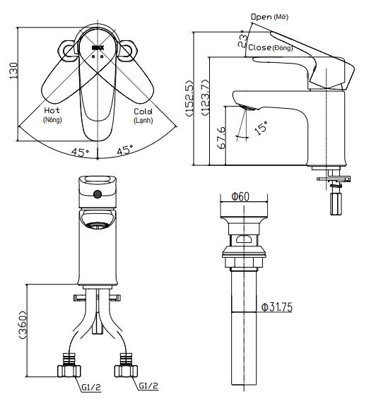 - Áp lực nước : 0.05 MPa ~ 0.75 MPa
